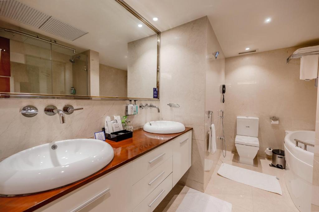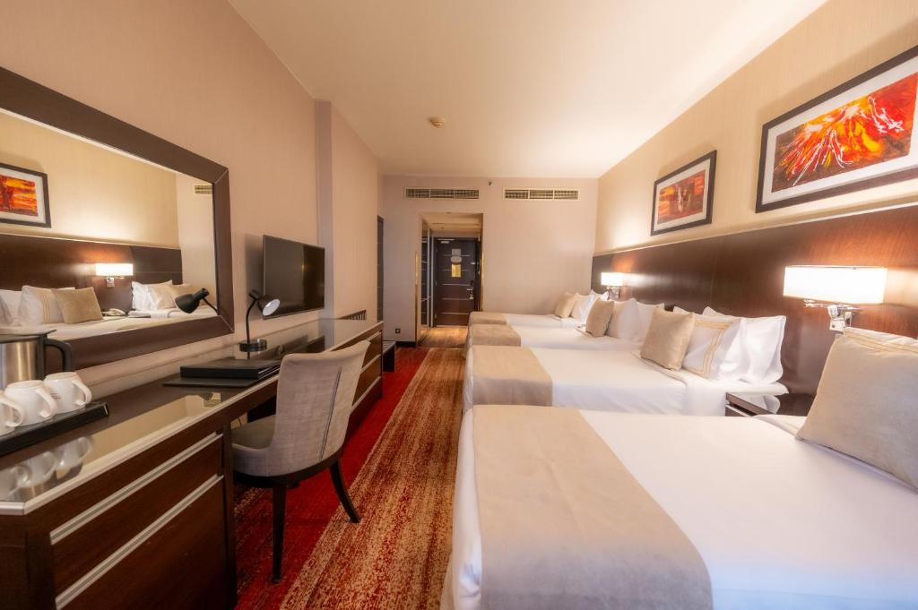 تتميز الغرف المكيّفة بأجواء باعثة على الدفء بفضل الأرضية المغطاة بالسجاد الأحمر والإضاءة المخفية، كما تضم كل غرفة تلفزيون بشاشة مسطحة مع قنوات فضائية ومشغل دي في دي، فيما تشمل الحمّامات الخاصة مغاسل مزدوجة بخزائن.
