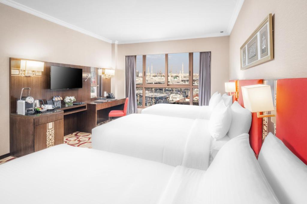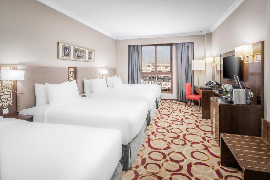 مكان إقامة "Millennium Taiba Hotel" إقامة مريحة: يوفر فندق ميلينيوم طيبة في المدينة المنورة غرفًا عائلية مكيفة مع حمامات خاصة وإطلالات على المدينة. تحتوي كل غرفة على مكتب للعمل وتلفزيون ومستلزمات استحمام مجانية. تجربة تناول الطعام: يمكن للضيوف الاستمتاع بالمأكولات العالمية في المطعم المناسب للعائلات، والذي يتميز بأجواء تقليدية وعصرية. تشمل خيارات الإفطار الوجبات القارية والأمريكية والبوفيه والحلال. المرافق والخدمات: يوفر الفندق مركزًا للياقة البدنية وخدمة واي فاي مجانية وخدمة نقل بأجر ومكتب استقبال يعمل على مدار 24 ساعة. تشمل وسائل الراحة الإضافية منطقة للأعمال ومواقف للدراجات وموقف سيارات خاص مجاني في الموقع. موقع متميز: يقع الفندق على بُعد 15 كم من مطار الأمير محمد بن عبد العزيز الدولي، وعلى بُعد 8 دقائق سيرًا على الأقدام من المسجد النبوي. تشمل المعالم القريبة مسجد القبلتين وجبل أحد.