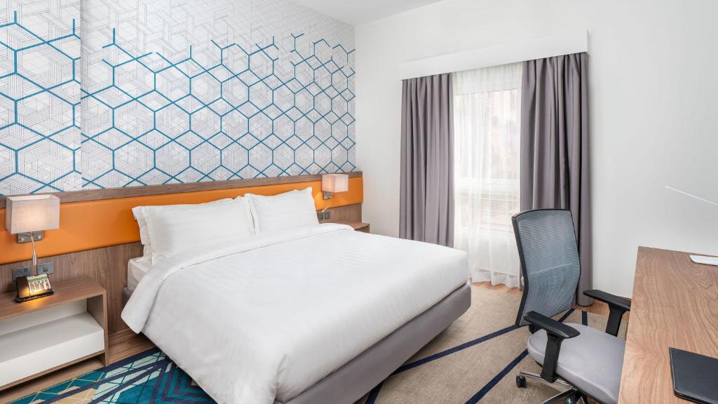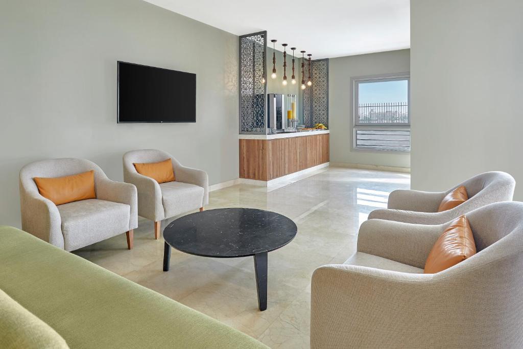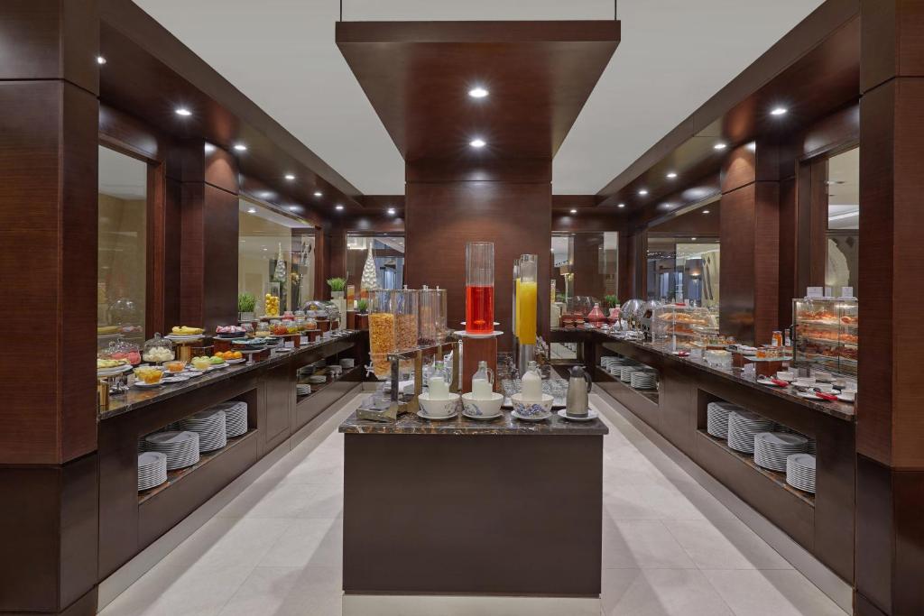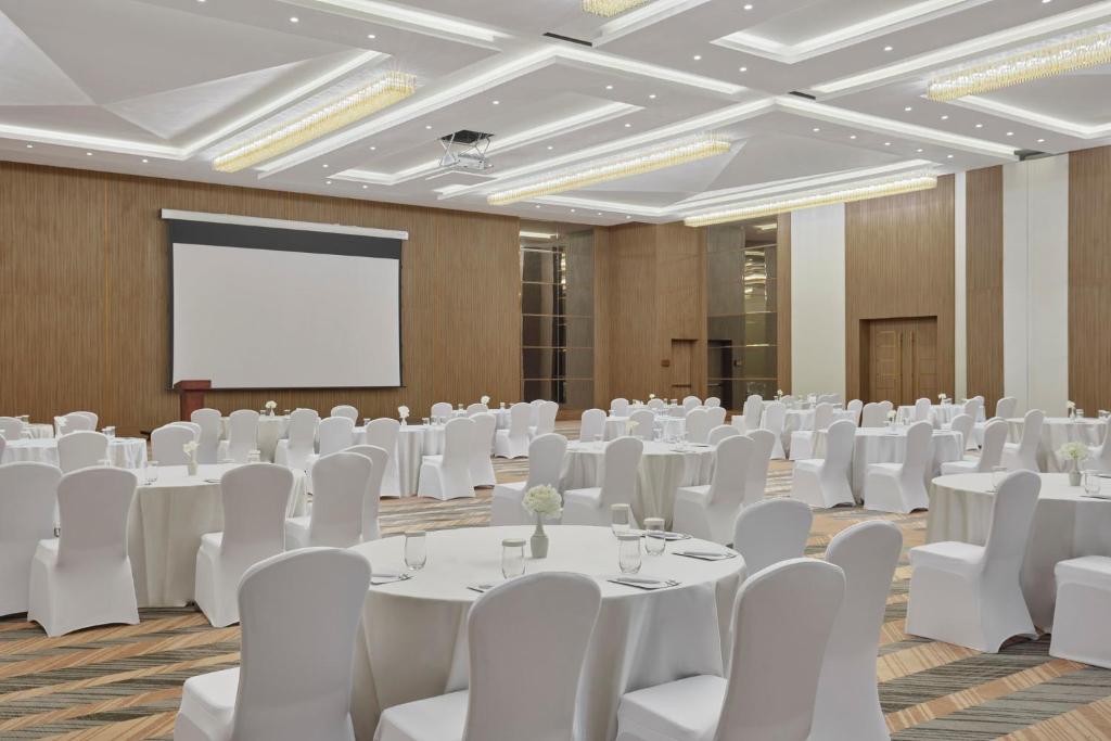 Holiday Inn Tabuk is located 1.9 mi from Tabuk International Airport. It has an outdoor pool and a fully-equipped fitness center, and provides free Wi-Fi throughout the hotel. All guest bedrooms at the Holiday Inn Tabuk hotel is equipped with air conditioning, satellite TV and a mini-bar. In addition, every room has a luxury private bathroom with complimentary bathroom amenities. A hot buffet breakfast is served each morning in the Al Walima Restaurant. For lunch and dinner, guests have a choice of buffet or A La Carte dining, with a wide range of Western and Oriental Cuisines on offer. Guests can enjoy a swim in the outdoor pool, or relax on a lounger on the peaceful sun terrace. The Holiday Inn Tabuk features state-of-the-art gym facilities, and there is also a games room with table tennis. The hotel is 1.6 mi from the center of Tabuk. Free on-site car parking is available.