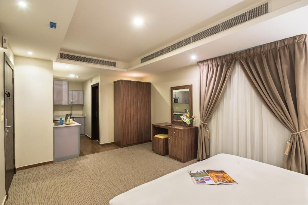 Comfortable Accommodations: Myrtle Al Shohadaa Serviced Apartments in Riyadh offers comfortable rooms with air-conditioning, private bathrooms, and balconies. Each room includes a kitchenette, TV, and free WiFi, ensuring a pleasant stay. Exceptional Facilities: Guests can enjoy a fitness center, sun terrace, and outdoor fireplace. Additional amenities include a lounge, coffee shop, and electric vehicle charging station. Free on-site private parking is available for convenience. Convenient Location: Located 12 mi from King Khalid International Airport, the hotel is near attractions such as Al Nakheel Mall (2.4 mi) and Riyadh Gallery Mall (6.8 mi). Guests appreciate the convenient location, attentive staff, and excellent service.