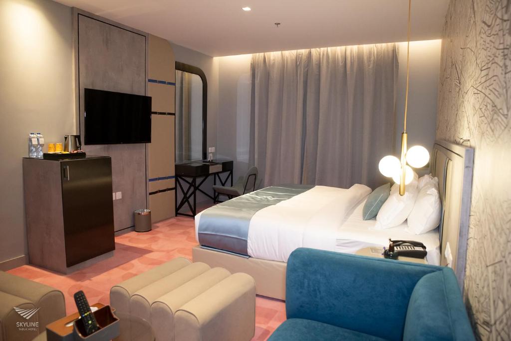 Comfortable Accommodations: Skyline Tabuk Hotel in Tabuk offers family rooms with air-conditioning, private bathrooms, and city views. Each room includes a mini-bar, TV, and soundproofing for a relaxing stay. Exceptional Facilities: Guests can enjoy a sauna, fitness center, terrace, restaurant, bar, and free WiFi. Additional amenities include a steam room, fitness room, and 24-hour front desk. Dining Experience: The family-friendly restaurant serves Indian, American, Middle Eastern, seafood, local, international, and barbecue grill cuisines. Breakfast options include continental, American, buffet, vegetarian, halal, and gluten-free. Convenient Location: Located 5 mi from Tabuk Regional Airport, the hotel is highly rated for its attentive staff, room cleanliness, and comfortable beds.